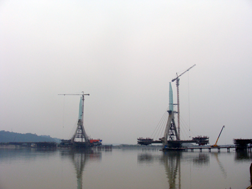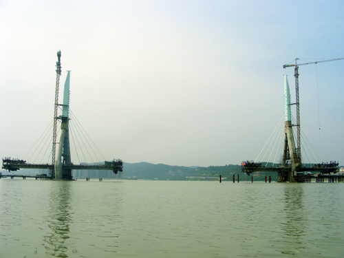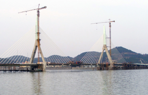 12#墩第二根斜拉索、13#墩第二根斜拉索掛設(shè)完成全景